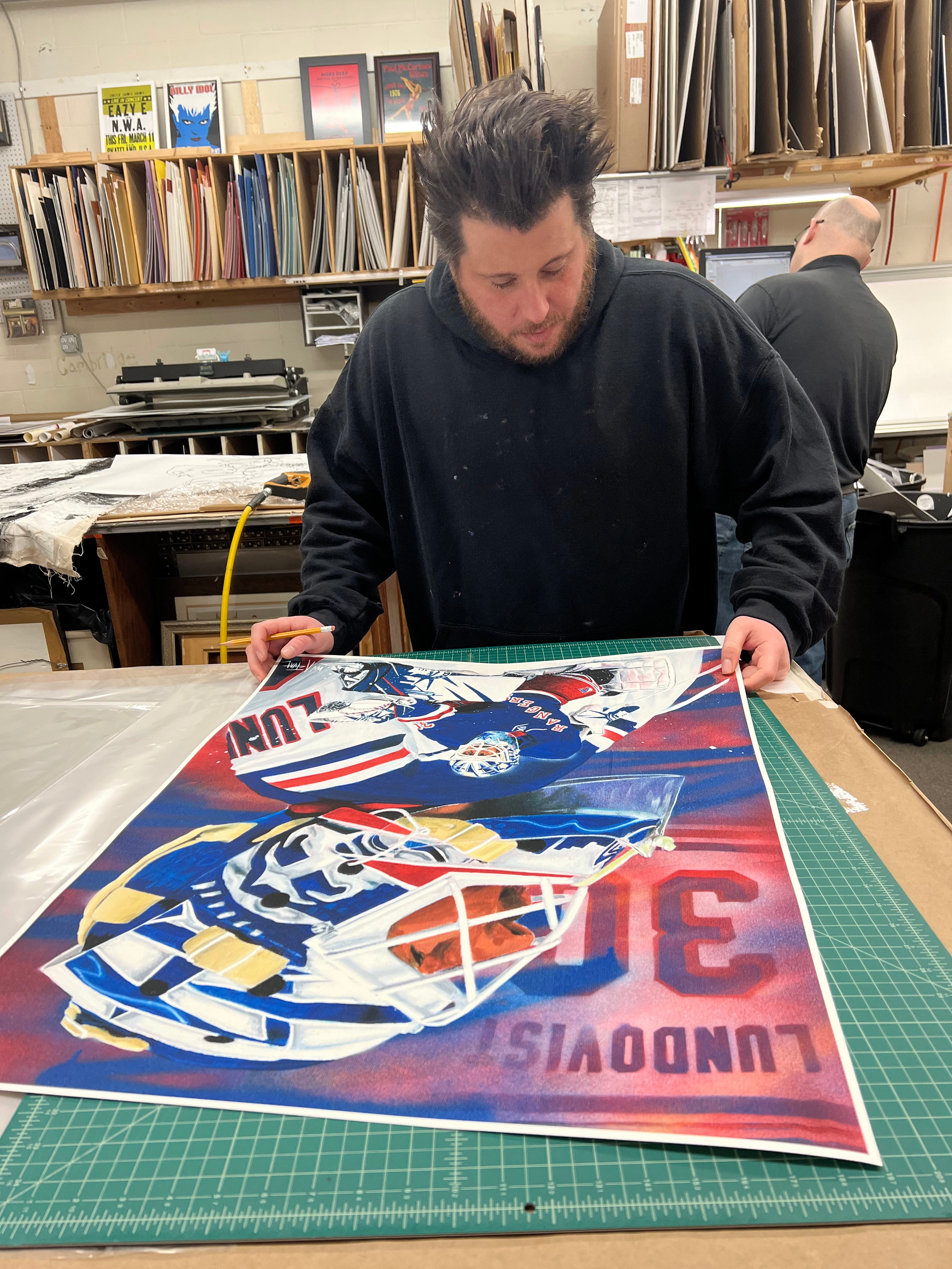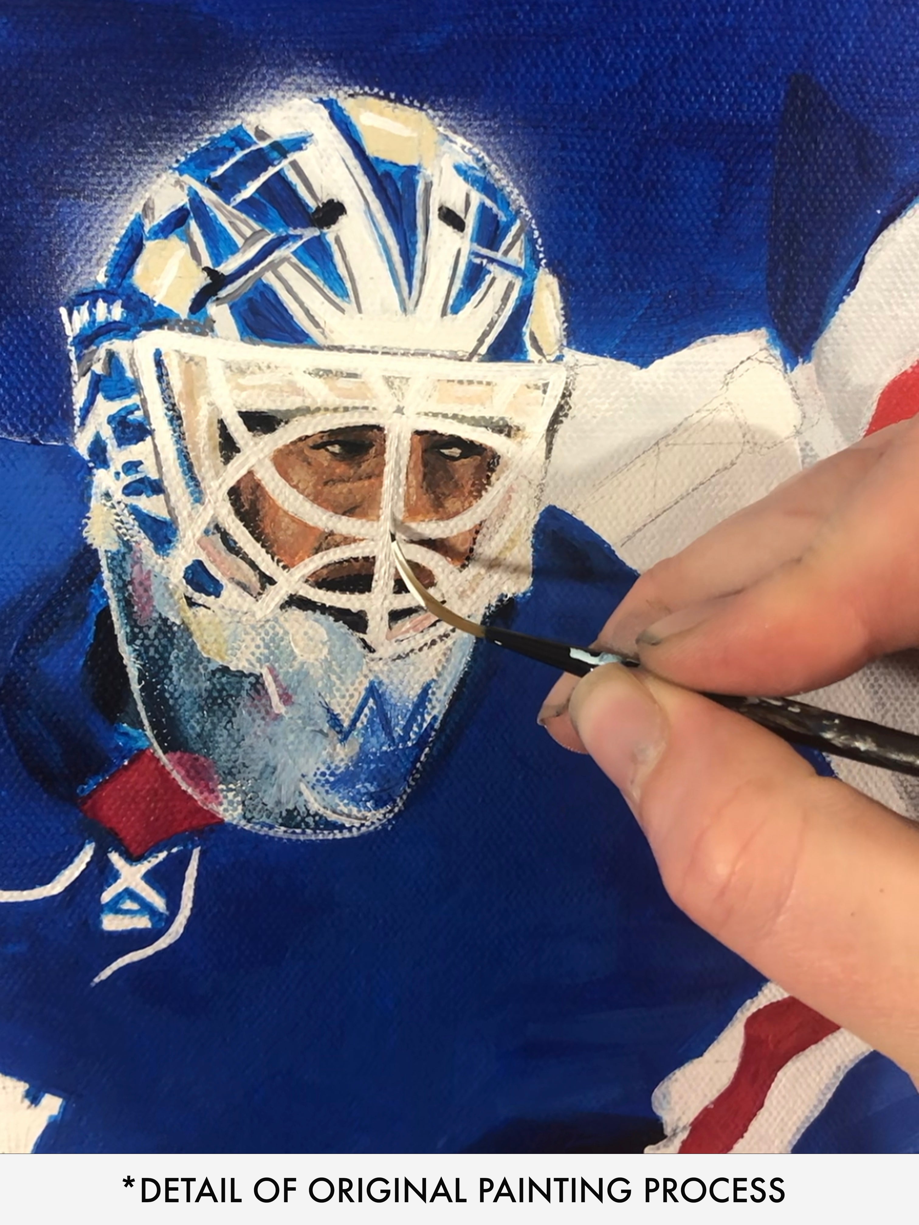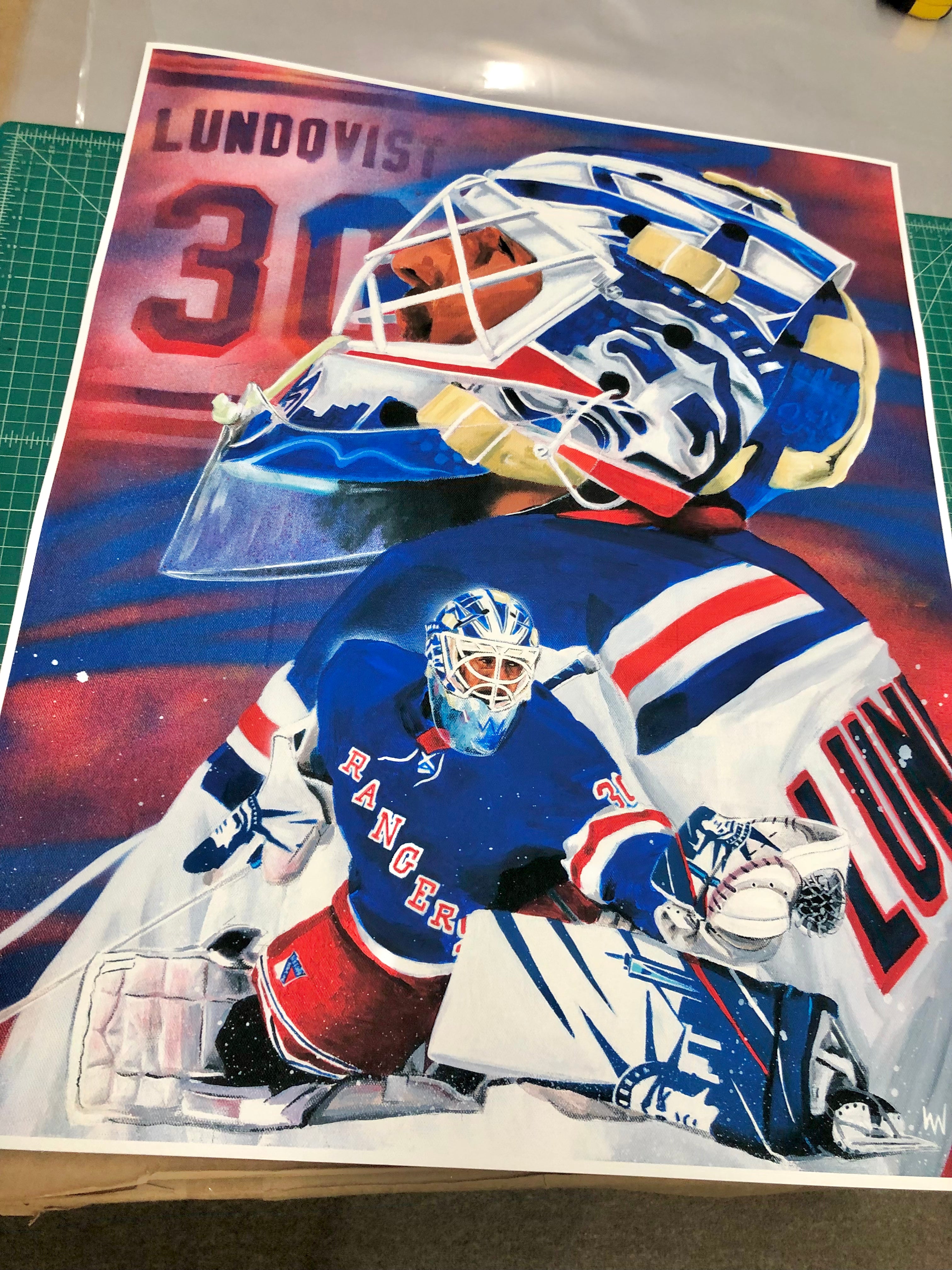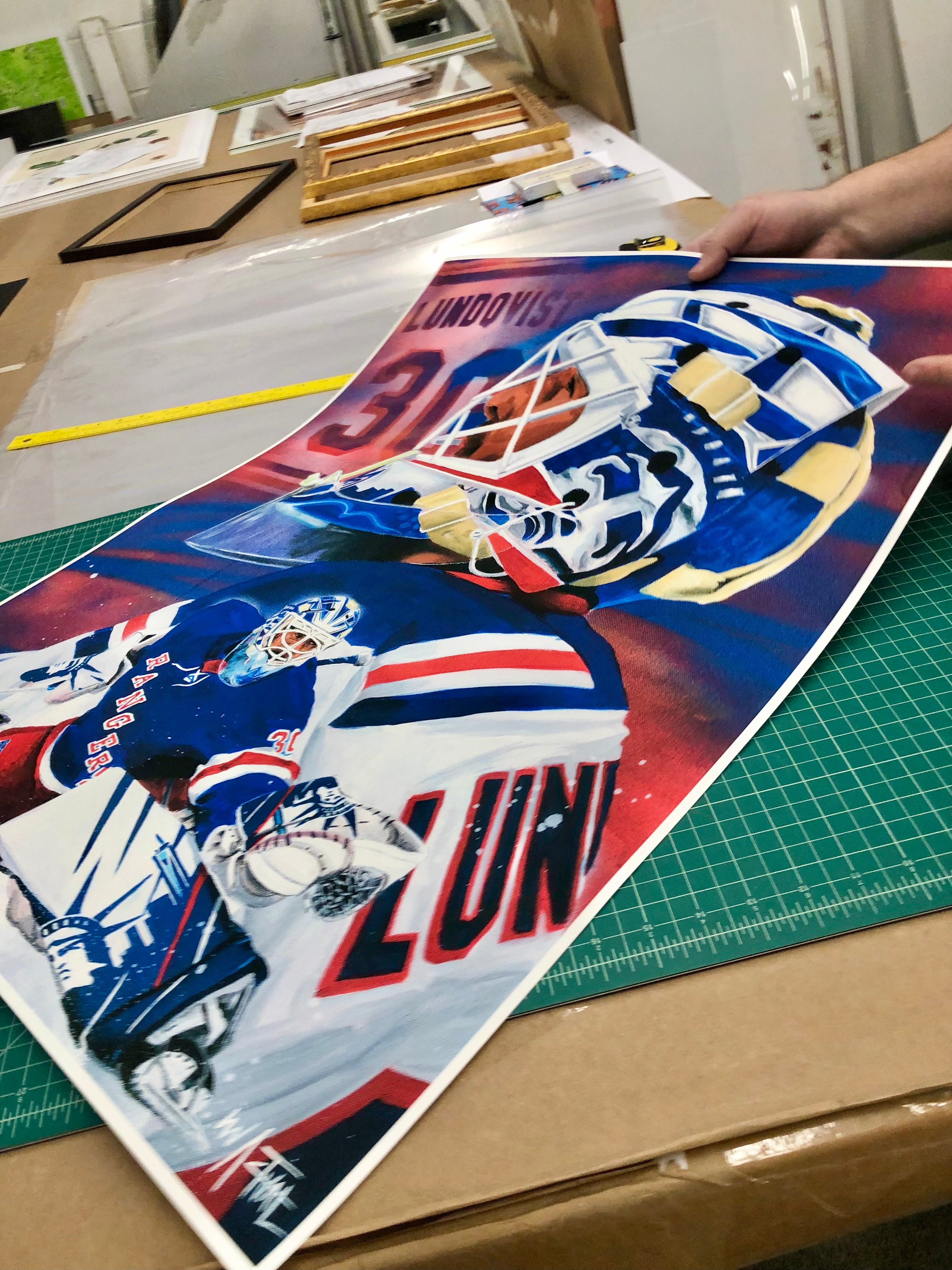 Only 30 of these beautifully rendered replicas of Ian Actuals "Long Live The King" Painting will be made. Paying tribute to the long and successful career of New York Rangers goaltender Henrik Lundqvist. Who this year had his jersey lifted into the rafters of Madison Square Garden next to other New York Rangers legends forever. Just like original painting this Gallery made series of prints, hot pressed on high end cotton rag paper capture the original painting down to the very last detail using archival inks. An impressive size print at 30" x 24" just like the original is a very standard size leaving you worry free when it comes to slipping it in a frame. A frame is not included but can be obtained easily and inexpensively through stores like Michaels as well as Amazon. Show of your New York Rangers Hockey Pride with this amazing piece of stunning art.