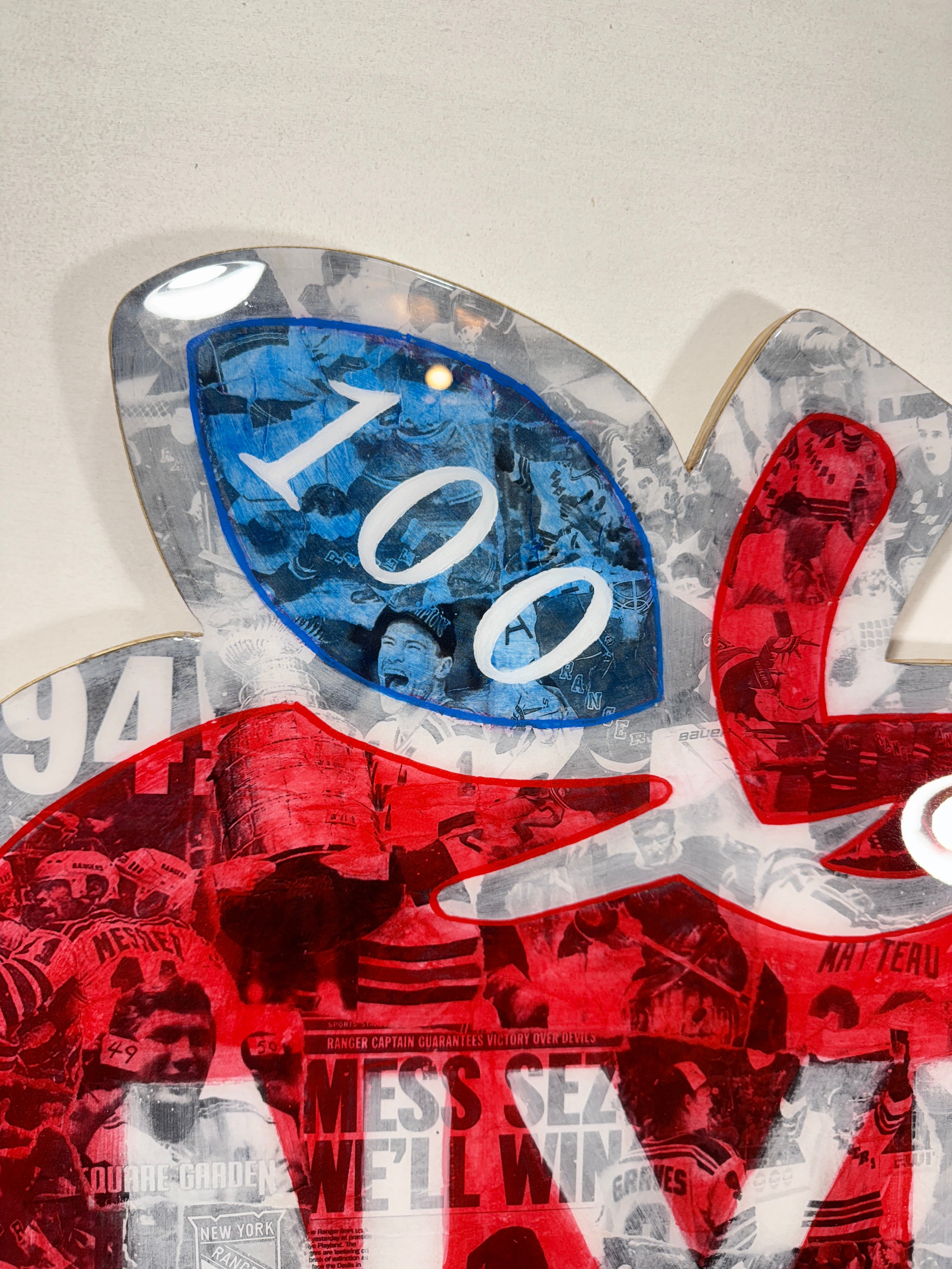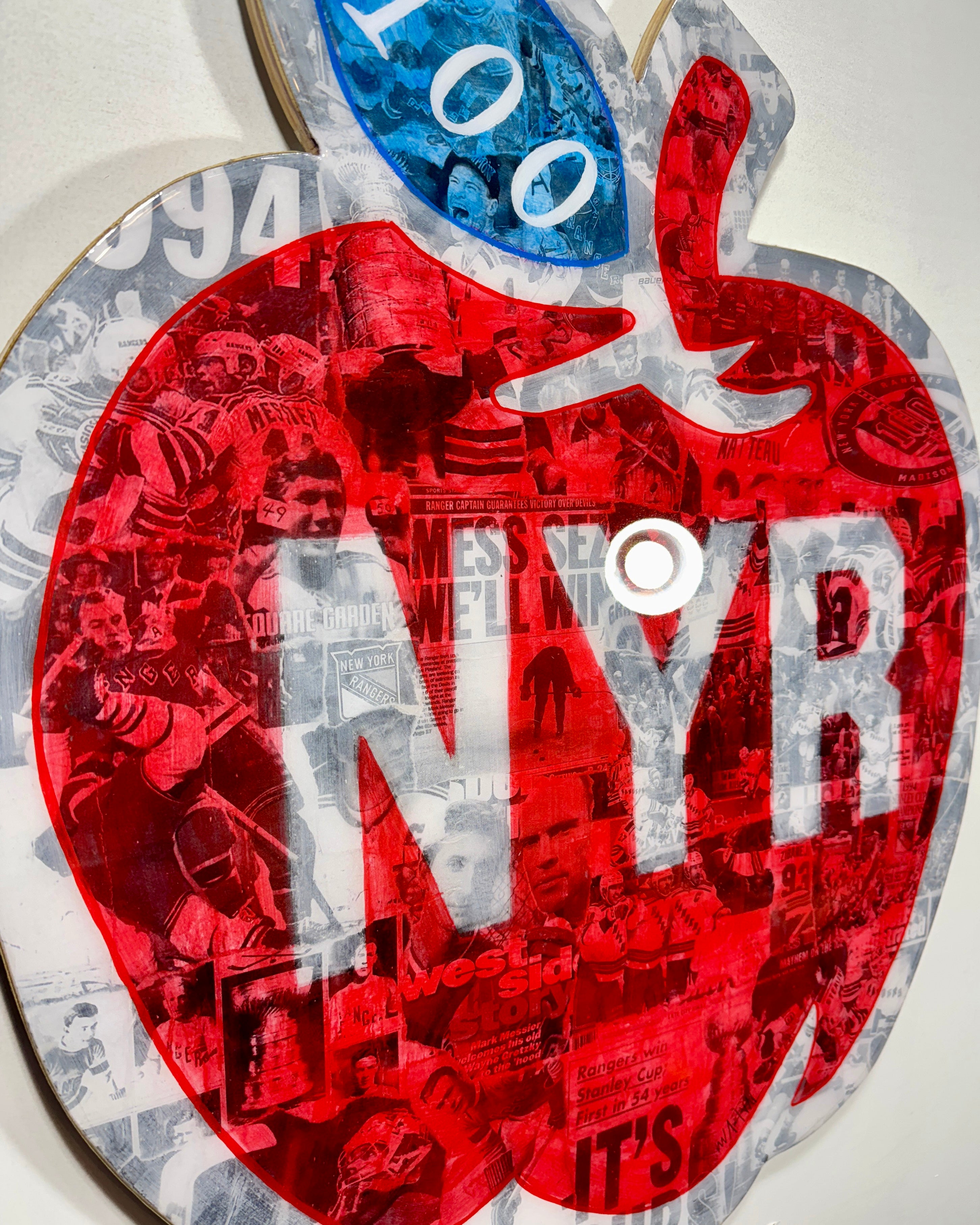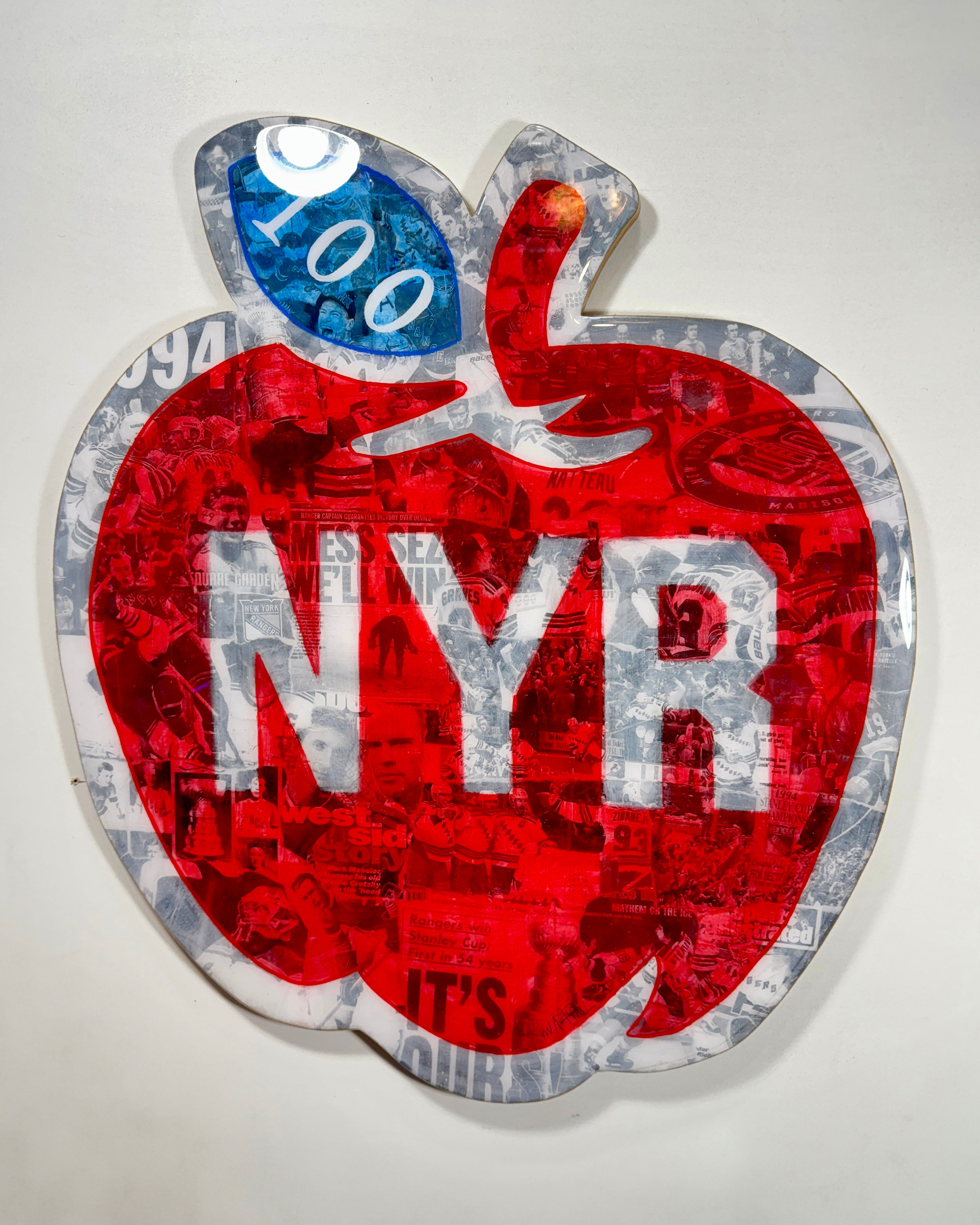 Shaped in a bold, eye catching Apple silhouette with “NYR” proudly displayed at the center, this artwork blends New York pride with a century of Rangers legacy. The collaged imagery sourced from historic moments, vintage clippings, and classic celebrations—creates a layered visual storytelling effect that brings Rangers history to life.