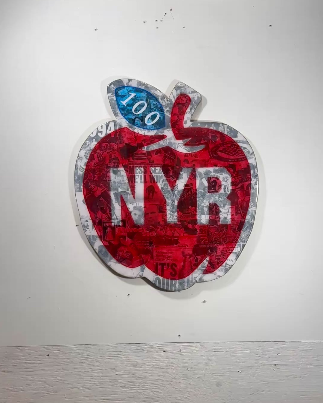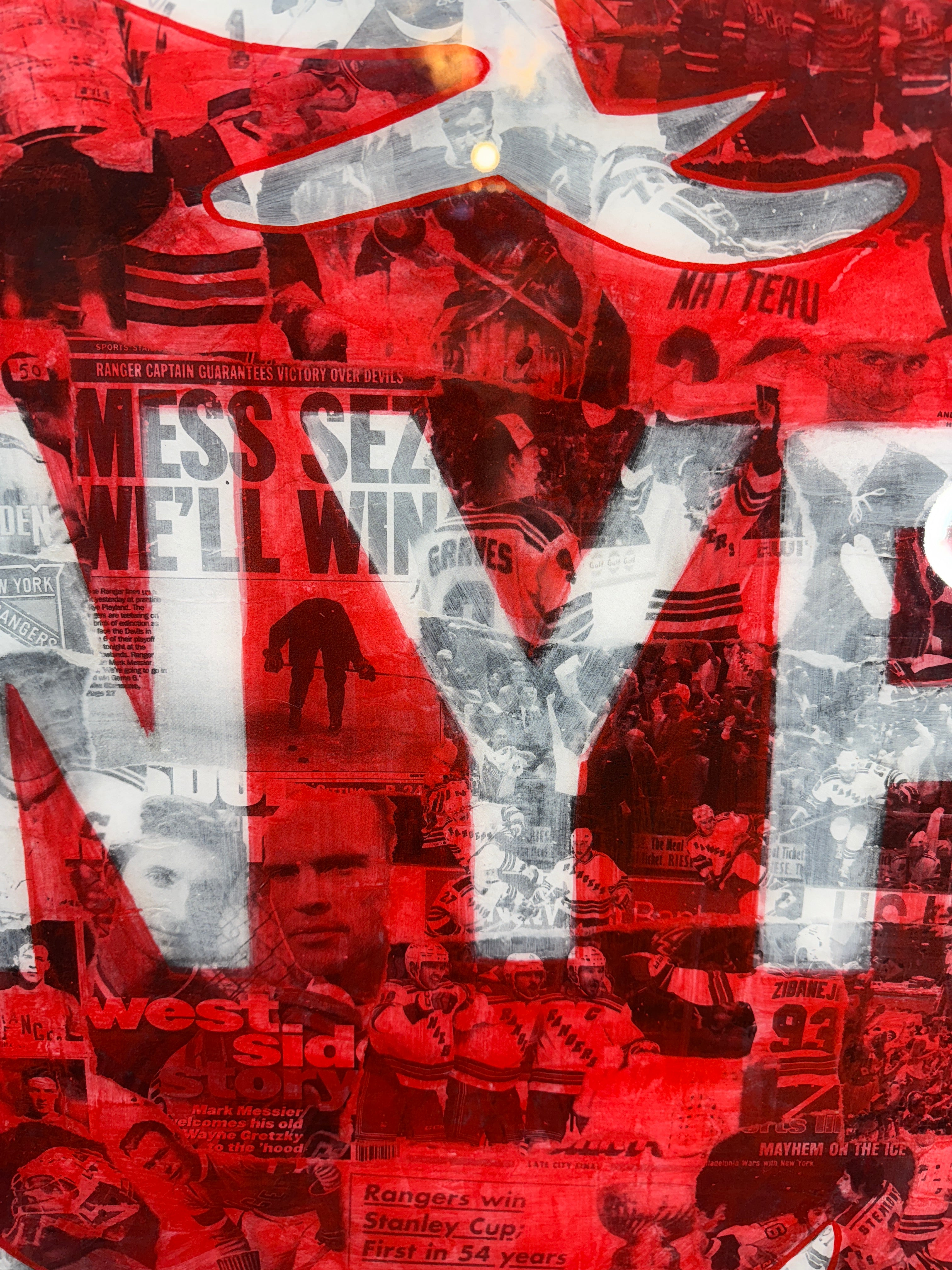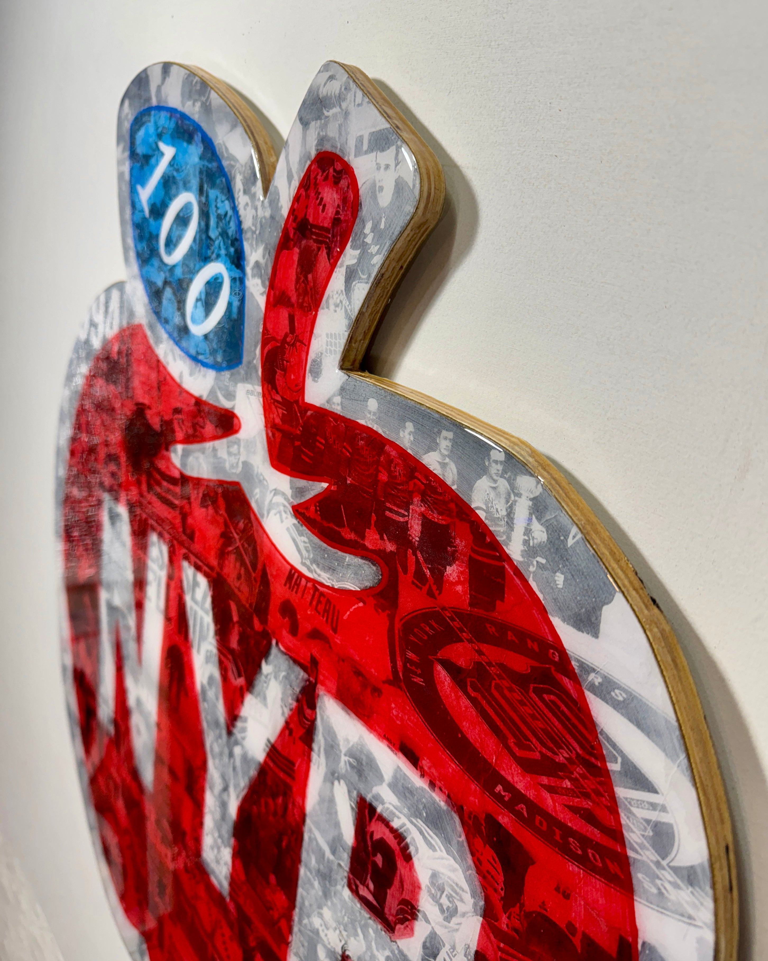 Shaped in a bold, eye catching Apple silhouette with “NYR” proudly displayed at the center, this artwork blends New York pride with a century of Rangers legacy. The collaged imagery sourced from historic moments, vintage clippings, and classic celebrations—creates a layered visual storytelling effect that brings Rangers history to life.
