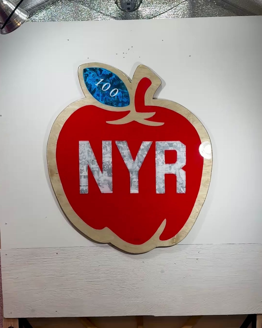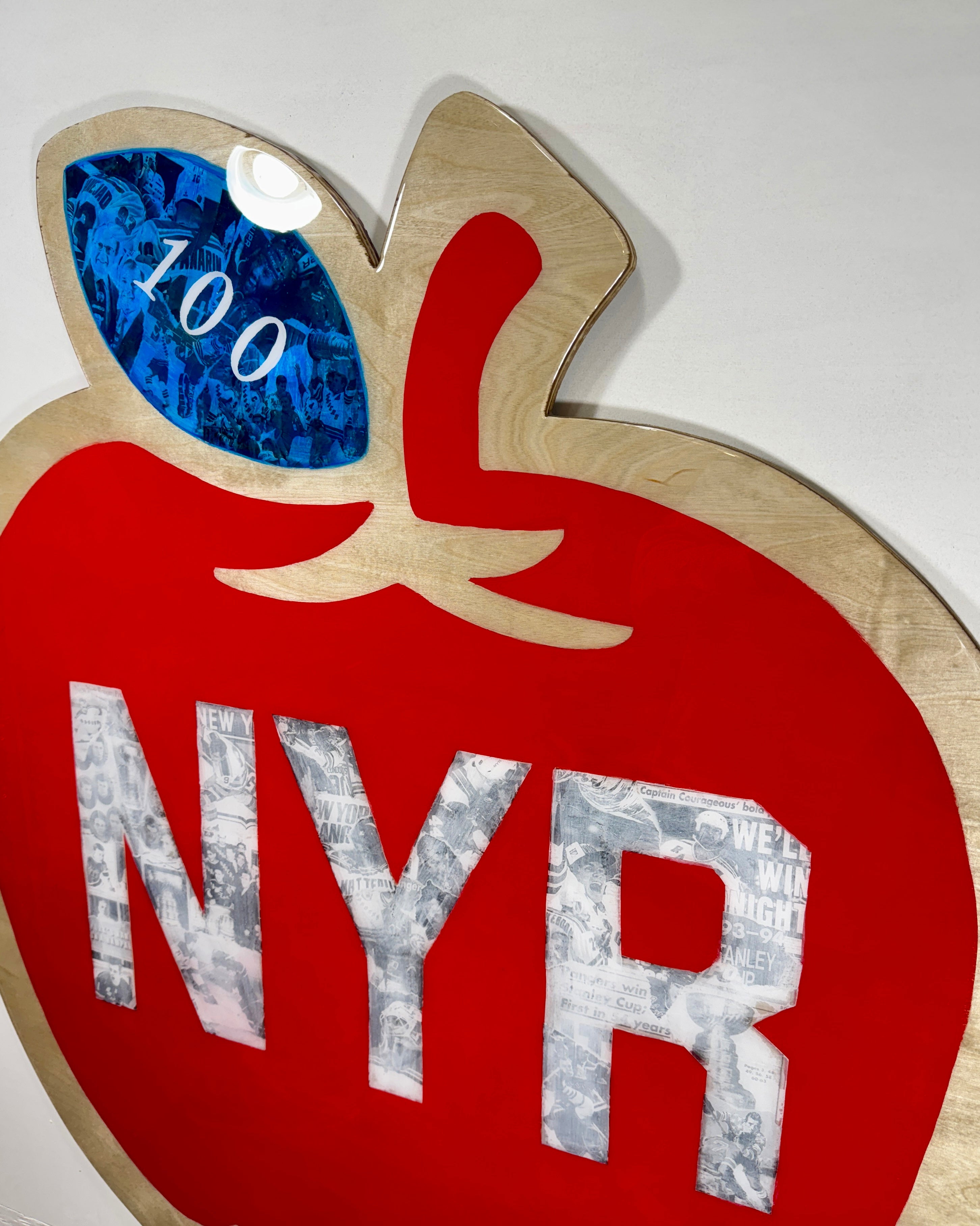 Measuring approximately 36 inches wide by 42 inches tall, this striking Big Apple–inspired design features a bold red silhouette with “NYR” at its center, layered over a detailed collage of historic moments, legendary players, and unforgettable memories from the team’s first 100 years. The leaf features a deep blue collage with “100,” representing a century of grit, passion, and iconic Rangers hockey.